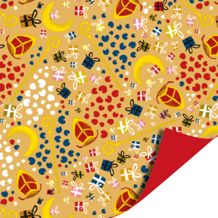 Dit dubbelzijdige cadeaupapier biedt variatie in ontwerp, zodat je kunt kiezen welke kant je gebruikt voor een extra creatieve twist. De ene zijde heeft een levendig patroon met iconische Sinterklaas-elementen zoals stoomboot, chocoladeletters en staf, terwijl de andere zijde een effen kleur heeft die perfect contrasteert voor een stijlvolle afwerking.