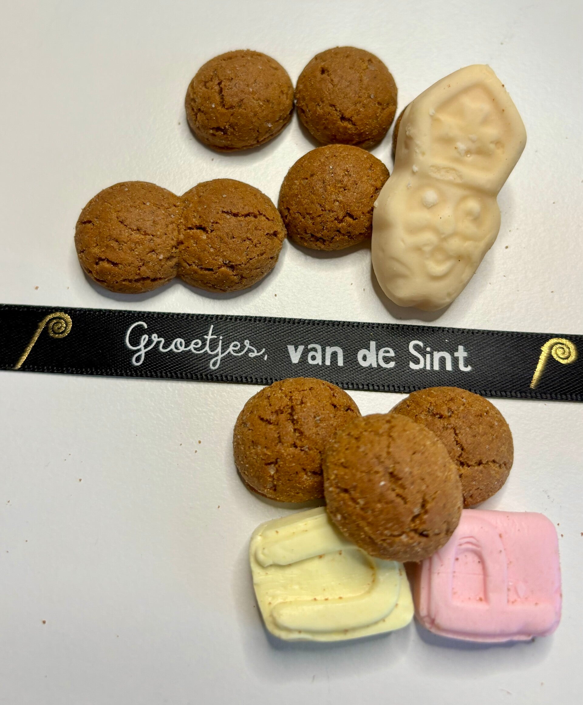 • Luxe satijn lint in zwart met de tekst “Groetjes van de Sint”