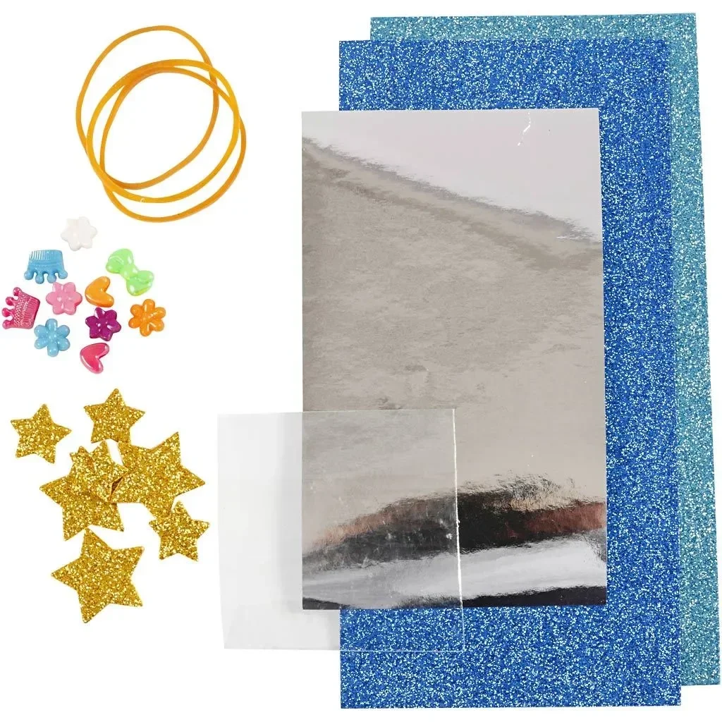 Inhoud: zelfklevende vellen en sterren van EVA-foam, elastiekjes, plastic kralen, metaalpapier, glitterpapier en hard folie.