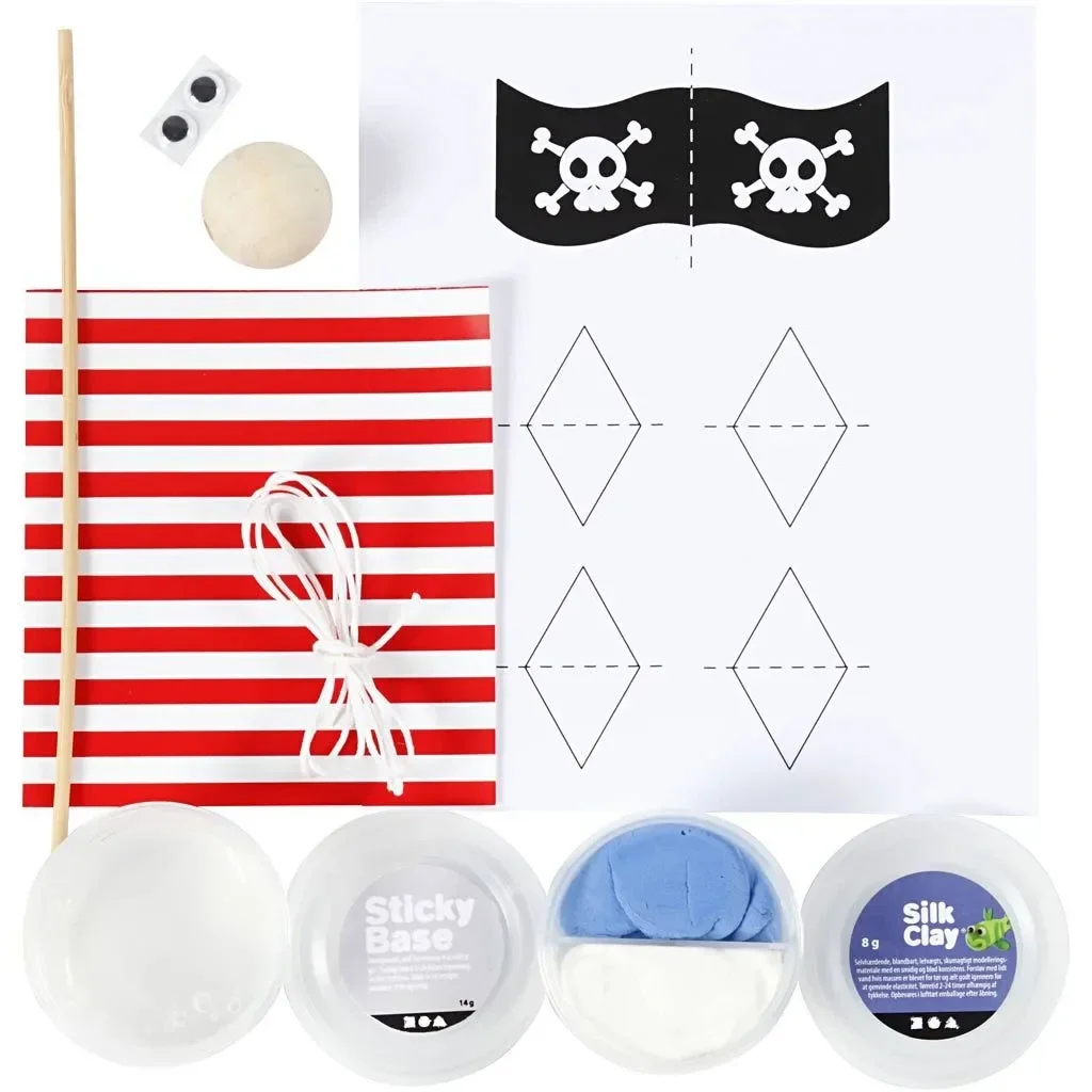 Ahoy, kapitein! Met deze creatieve knutselset bouw je jouw eigen piratenschip én bemanning van Silk Clay. Gebruik de meegeleverde materialen én een lege eierdoos om een stoer schip met zeilen, vlaggen en een echte piraat te maken. Zelfs de verpakking wordt onderdeel van je creatie!