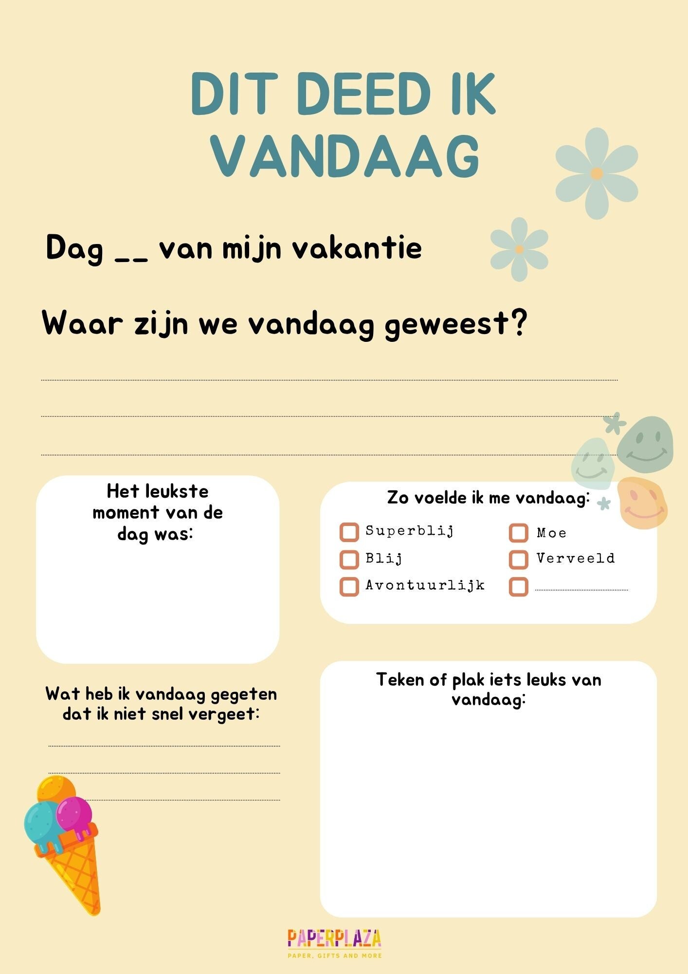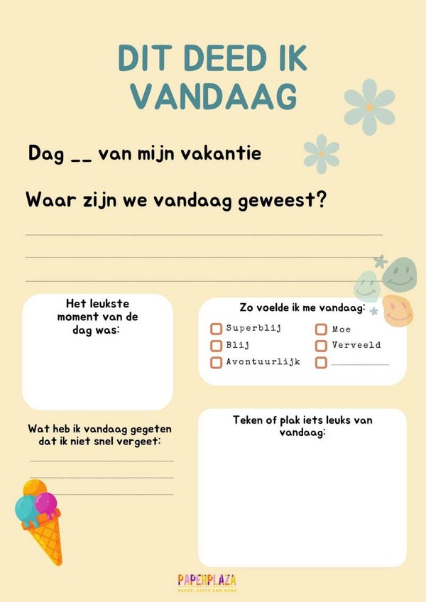 - Dagpagina’s om in te vullen: “Waar zijn we vandaag geweest?”, “Wat was het leukste?”, “Hoe voelde ik me?”