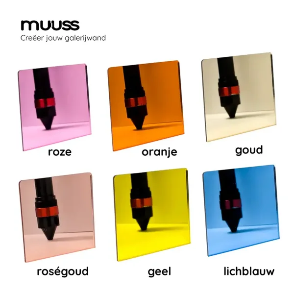 Kies uit roze, oranje, roségoud, goud, lichtblauw of geel en maak van jouw muur een unieke blikvanger. Dankzij het slimme Muuss systeem wissel je eenvoudig van kleur of combineer je meerdere spiegeltjes voor een speels en persoonlijk effect.