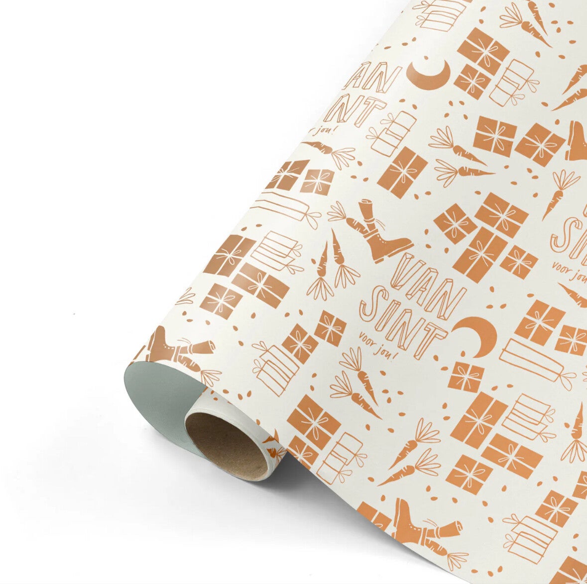 Pak je cadeaus extra stijlvol in met dit prachtige dubbelzijdige Sinterklaas cadeaupapier! De ene zijde heeft een feestelijke Sinterklaasprint in wit en brons met illustraties van cadeautjes, worteltjes en de tekst “Van Sint voor jou!”. De andere zijde is effen mintgroen – perfect voor een subtiele, moderne afwerking.