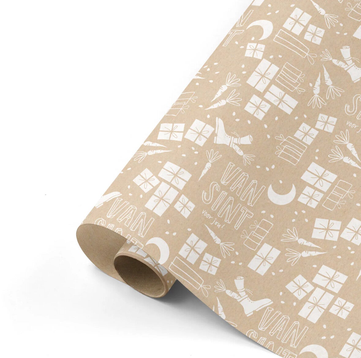Geef je cadeautjes een stijlvolle, natuurlijke uitstraling met dit prachtige Sinterklaas kraft cadeaupapier! De neutrale kraftkleur in combinatie met de witte Sinterklaasprint – met illustraties van cadeautjes, wortels en de tekst “Van Sint voor jou!” – zorgt voor een feestelijke en moderne look.